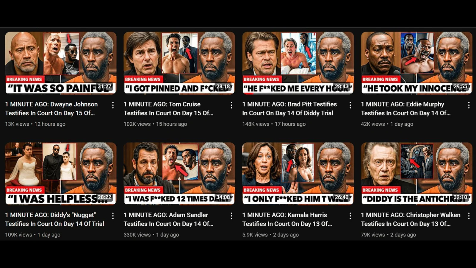 The narrator weaves in even more outlandish details, such as tales of secret meetings involving major Hollywood stars like Tom Hanks, Steve Harvey, and Jim Carrey, and that Cruise’s alleged association with Diddy began at a party in Cannes in 2004. Descriptions of Cruise’s court appearance are oddly specific, including attire and body language: “his posture stiff, face expressionless.” The video claims the interactions shifted from a business opportunity to something more ominous, claiming