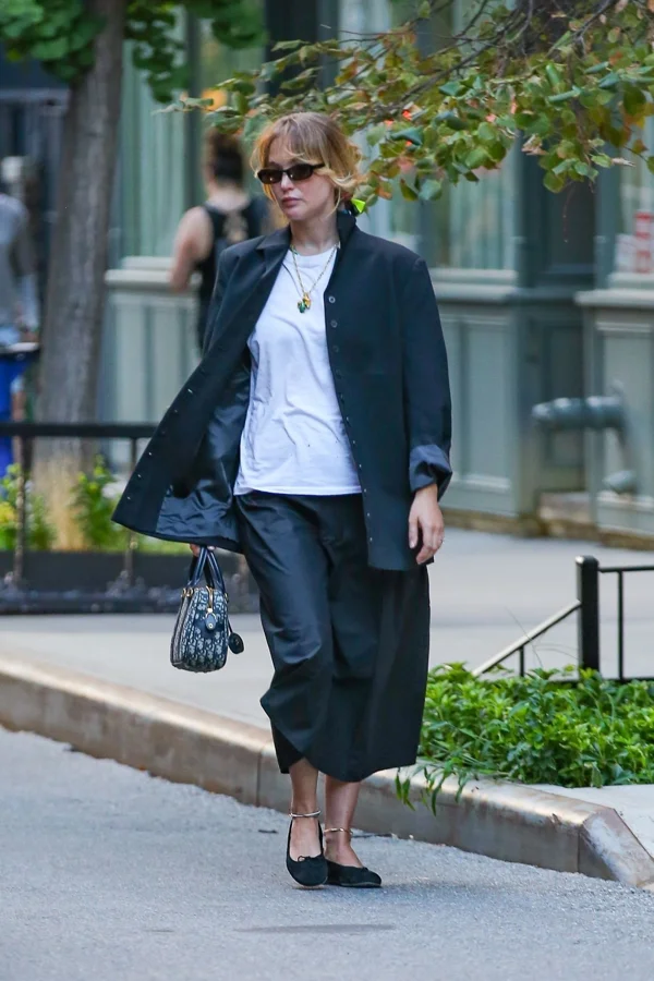 Completing her outfit, Lawrence donned black ballet flats paired with delicate gold anklets, evoking a fashion vibe that resonates both with early 2000s trends and today’s street style. To add a subtle pop of color, she incorporated an oversized scrunchie, a nod to the recent Copenhagen Fashion Week craze, which brought a fresh and playful element to her refined black-and-white outfit.