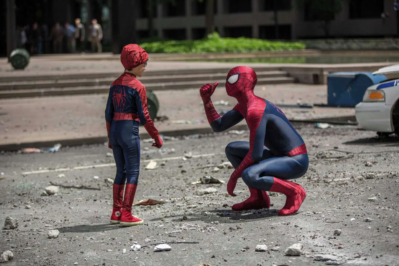 Unlike his earlier failure, where his webbing inadvertently caused Gwen’s fatal injury, Garfield’s Peter secures Michelle carefully, shooting his webbing upward to ensure a safe landing for both. Once on the ground, Michelle notices the anguish on Peter’s face, which evokes the memory of Gwen’s demise, but he reassures her with tears that he is all right.